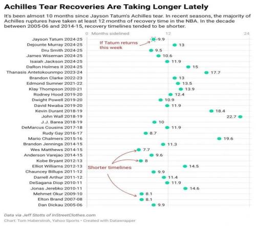 上圖是2005年之後NBA遭遇跟腱撕裂球員的複出耗時,可以看出來,在2016年之前,許多球員(包括布蘭德、科比等人)在8、9個月就完成複出,但是客觀說,這幾位複出之後的狀態沒有一個回到了巔峰水平。