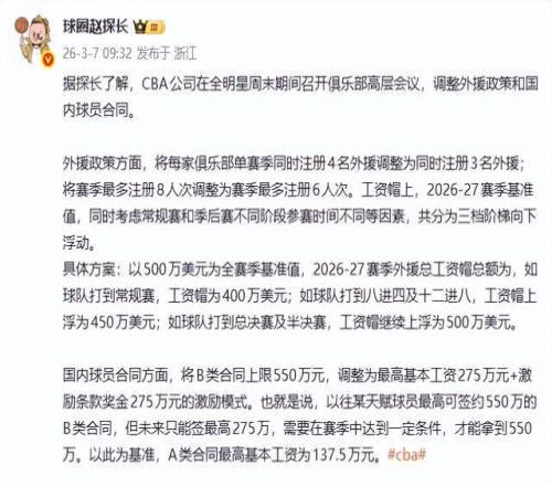 北京時間3月7日消息,根據著名博主“球圈趙探長”報道,CBA外援新政重磅落地!2026-27賽季起,外援注冊規則與工資帽全麵重構,俱樂部迎來“精兵簡政”新時代。