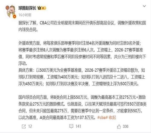 根據媒體人所講,CBA公司在全明星賽期間召開高層會議,下賽季每支球隊最多可以同時注冊3名外援(本賽季為4名),下賽季外援注冊人次調整為6人次(本賽季為8人次,上賽季沒有限製);另外關於外援工資帽的問題,隻打常規賽的球隊外援工資帽是400萬美元,打到季後賽12強或者8強的球隊,外援工資帽是450萬美元,半決賽(四強)的球隊外援工資帽是500萬美元。