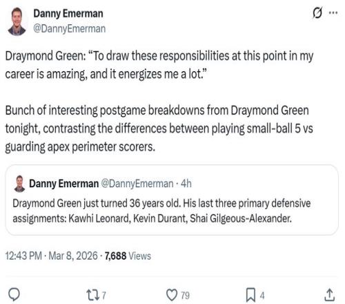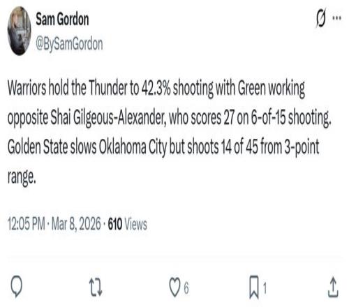 賽後勇士記者Sam Gordon點名稱讚到:“勇士本場將雷霆的投籃命中率限製在42.3%,追夢大部分時間都在對位亞曆山大,讓後者15投僅6中,成功限製住了雷霆的進攻,隻可惜自己三分球45投僅14中。”