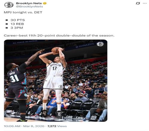 這場比賽小邁克爾-波特39分鍾,25中10,三分12中3,罰球7中7,拿到30分13籃板1助攻2搶斷1蓋帽,他已經第11場比賽完成20+10的數據。