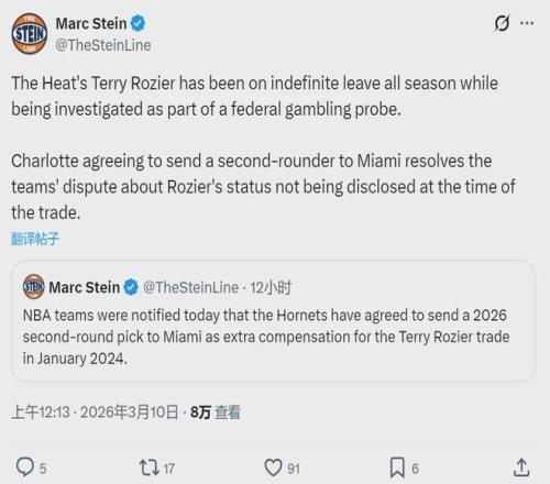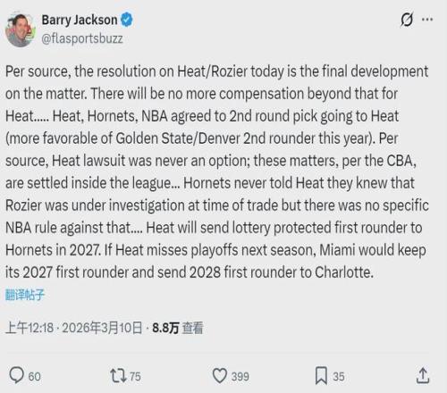 北京時間3月10日,據NBA名記Shams和Marc Stein報道,NBA聯盟的各支球隊今天接到一個通知,黃蜂隊已經同意將2026年次輪簽送給熱火,作為羅齊爾的交易補償。這個次輪簽是掘金和勇士順位更高的那個,目前預計是勇士的次輪中段。