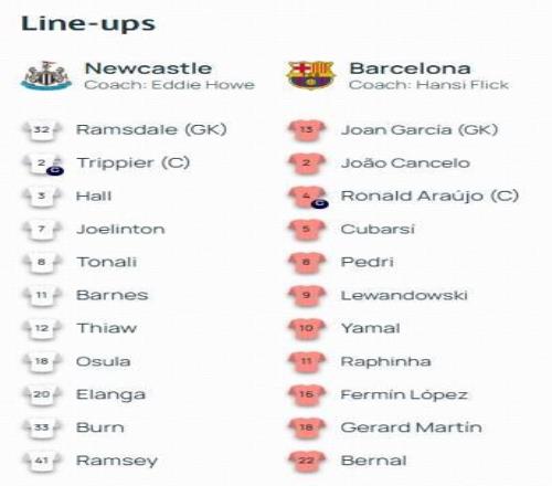 巴薩首發:13-霍安-加西亞、18-赫拉德-馬丁、5-庫巴西、4-阿勞霍、2-坎塞洛、22-馬克-貝爾納爾、8-佩德裏、11-拉菲尼亞、16-費爾明-洛佩斯、10-亞馬爾、9-萊萬多夫斯基