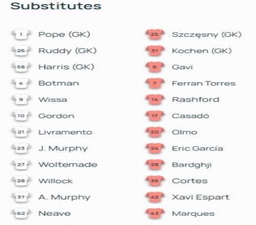 替補:6-加維、7-費蘭-托雷斯、14-拉什福德、17-卡薩多、20-奧爾莫、24-埃裏克-加西亞、25-什琴斯尼、28-巴爾德吉、31-迭戈-科亨、36-科爾特斯、42-埃斯帕特、43-湯米-馬克斯