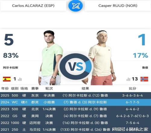 去年ATP500東京站半決賽,兩人職業生涯第六次交鋒,也是最近一次交鋒,帶傷作戰的阿爾卡拉斯3:6先輸一盤之後,以6:3 6:4的比分連扳兩盤,逆轉戰勝了魯德。最後決賽,阿爾卡拉斯兩盤完勝美國奶爸弗裏茨,職業生涯首次參加該站賽事就奪取冠軍。