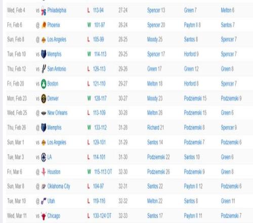 自1月31日對陣活塞後庫裏就高掛免戰牌,這期間勇士的15場比賽輸掉了其中10場,勇士也從西部第八掉到西部第九,勇士與快船的勝場已經拉開到1個,勇士已經處於附加賽下半區。