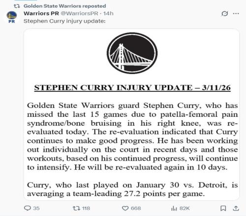 根據勇士官方的說法,庫裏因為右膝髕股疼痛綜合征/骨挫傷已連續缺席15場比賽,球隊對他進行了新的評估。評估結果顯示庫裏的恢複取得了進展但還沒有達到回歸賽場的要求,他將在10天後再度評估。