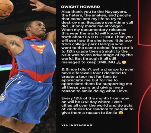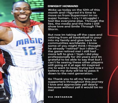 3月13日,40歲的前NBA球星德懷特·霍華德在社媒發表長文宣布正式退役。霍華德生涯曾先後效力於魔術、湖人、火箭、老鷹、黃蜂、奇才、湖人、76人、湖人和中國台灣聯賽雲豹。