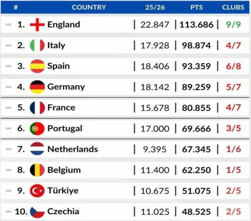 英超在歐足聯係數積分榜上遙遙領先