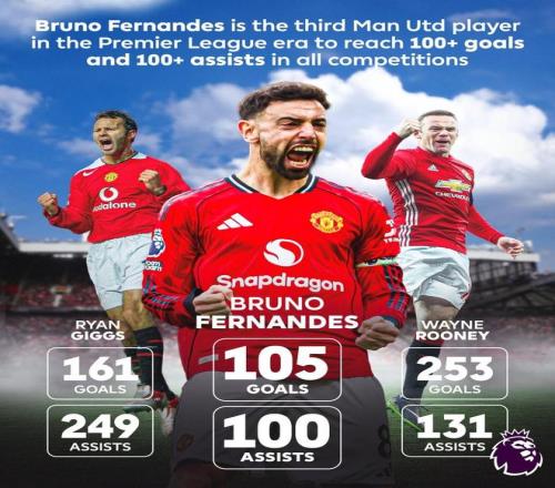 據統計,布魯諾-費爾南德斯成為英超時代第三位各項賽事進球和助攻數均達到100的曼聯球員,前兩位分別是吉格斯(161球249助)和魯尼(253球131助)。