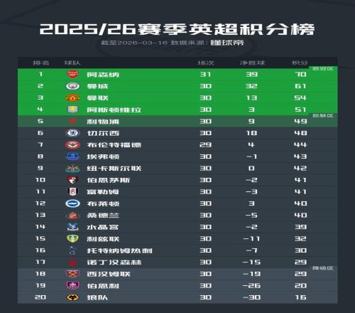 北京時間3月16日,英超聯賽第30輪的10場比賽有9場已經結束,本輪領頭羊阿森納再度取勝,排名第二的曼城則在客場被西漢姆聯逼平,曼聯主場3-1拿下阿斯頓維拉,利物浦主場1-1戰平近況不佳的托特納姆熱刺,切爾西則在主場0-1輸給了紐卡斯爾聯。