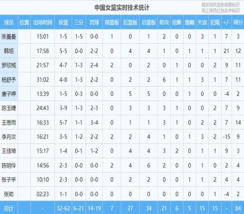 球員數據統計,王思雨14分1板3助、韓旭12分4板1助、楊舒予11分2板6助、羅欣棫11分2板、李月汝9分4板1助、陳玉婕9分3板3助、陳明伶4分6板2助、張子宇4分2板、王佳琦3分4板3助2斷、張曼曼3分1板2助、唐子婷2分5板、張茹2分