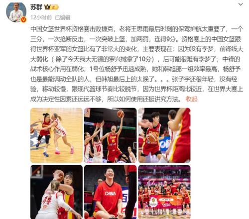 賽後,媒體人蘇群也是發文中國隊的表現,談到張子宇時,指出:“張子宇還很年輕,沒有經驗,移動較慢,跟現代籃球節奏比較脫節,因為世界杯距離比較近,在世界大賽上成為決定性因素還遠遠不夠,所以如何使用還挺講究方法”。