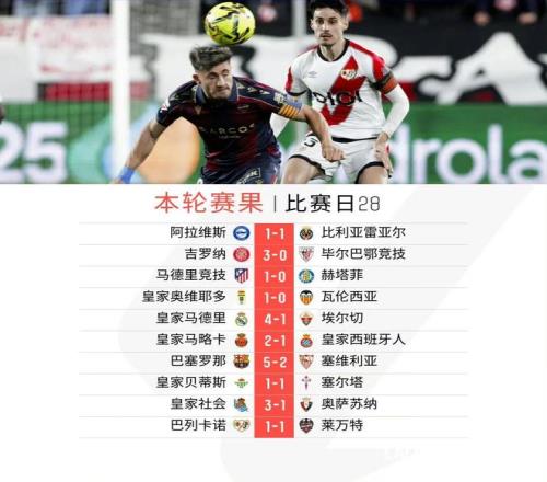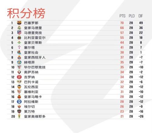 北京時間3月17日淩晨,巴列卡諾1比1戰平萊萬特,西甲聯賽第28輪十場比賽全部結束較量。本輪巴薩5比2大勝塞維利亞,皇馬同樣4比1輕取埃爾切,目前巴薩積70分繼續位列榜首,皇馬則積66分排名第2。馬德裏競技本輪贏球,1比0擊敗赫塔費,由於比利亞雷亞爾1比1戰平阿拉維斯,馬競獨享聯賽第3的位置,但排名第4的黃潛已經領先第5的皇家貝蒂斯已經多達11分。