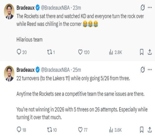 火記:火箭球員們就站在那裏看著杜蘭特一頓運球,謝潑德則蹲在底角,這真是喜劇的一幕。火箭出現22次失誤湖人才11次,火箭隊三分26中5,每當火箭遇上富有競爭力的對手就會出現相同的問題。在2026年這樣的表現是無法贏球的。