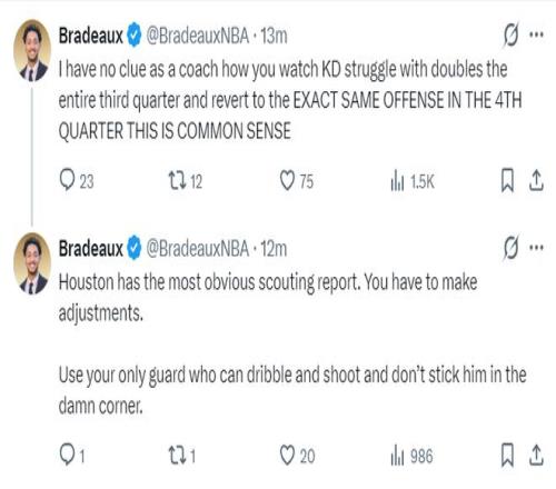 火記:休斯頓現在的情況一目了然,烏度卡就該做出調整,明明有一個可以控球的後衛,你卻把他放在該死的底角。作為教練我實在是搞不懂,你讓杜蘭特整個下半場被高位包夾卻沒有任何的戰術調整,這簡直就是常識問題。
