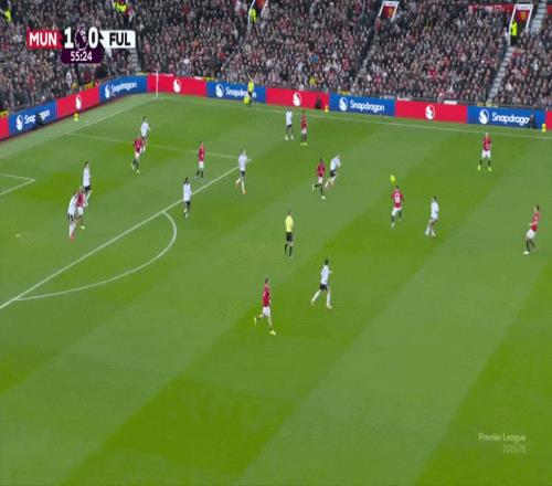 從右路內收的阿馬德,斜插跑向曼城防線間的空隙,而費爾南德斯則作為第三攻擊手向右邊路跑動,曼城後衛阿克被夾在兩人之間,陷入兩難。
