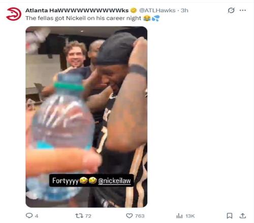賽後老鷹全隊在更衣室朝著亞曆山大-沃克瘋狂的澆水慶祝,因為沃克才是這場比賽贏球的第一功臣,他打出職業生涯之夜。