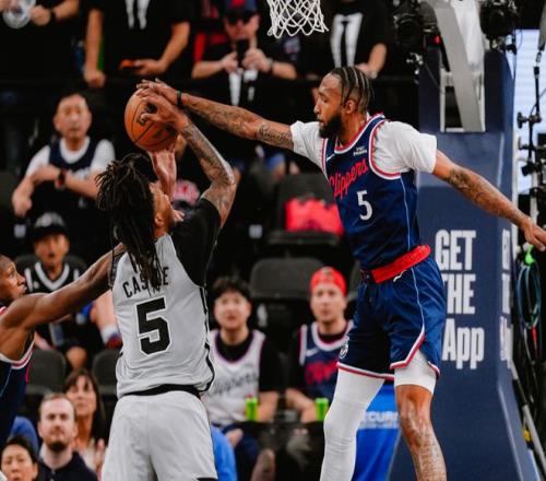 瓦塞爾起飛暴扣止血後,福克斯單打,卡斯爾搶斷飛扣,馬刺追分很快。關鍵時刻加蘭連中兩記三分,馬瑟琳上場後帶領替補衝擊籃下,不過馬刺依靠巴恩斯和福克斯屢屢給出回應,雙方陷入拉鋸戰,第一節快船37-29馬刺。進入第二節,卡斯爾補籃打成2+1,此後文班亞馬上空籃,麥克勞林轟三分,馬刺追平了!快船進攻停滯,卡斯爾繼續肆虐籃下!直到中段,馬瑟琳和科林斯才幫快船止血。但很快文班亞馬三分開張,約翰遜連續強攻籃下得手,瓦塞爾續上底角三分,馬刺拉開10分分差。