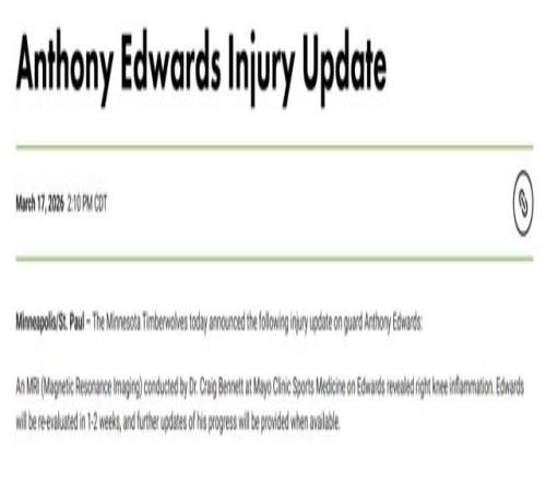 北京時間3月18日,森林狼隊官方宣布,安東尼-愛德華茲因右膝酸痛今日將缺戰太陽。他接受了核磁共振檢查,結果顯示其右膝存在炎症。據森林狼方麵透露,愛德華茲將在1~2周後接受複查,後續情況將在有更新時對外公布。