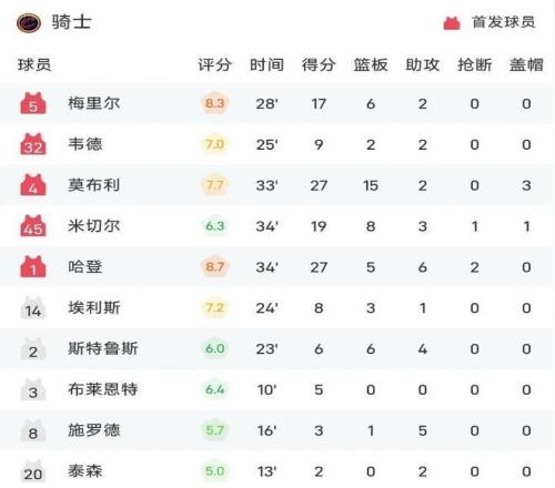 第三個關鍵短板則是角色球員整體發揮極不穩定,替補深度嚴重不足。除哈登、莫布裏與梅裏爾三人外,其餘球員得分貢獻極為有限:首發後衛韋德僅得9分,斯特魯斯與施羅德雙雙未能突破兩位數,替補席更未提供任何實質性火力支援。