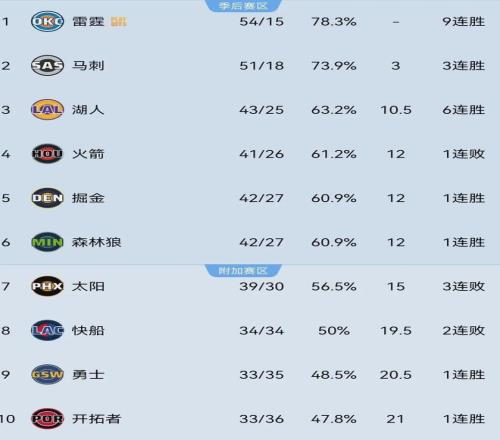本賽季至今,雷霆戰績為54勝15負高居西部&聯盟榜首,馬刺51勝18負和湖人43勝25負緊隨其後。