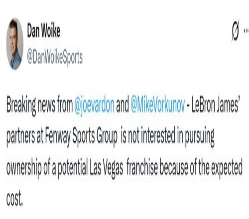 據兩位直接了解芬威意圖的消息源向The Athletic透露,詹姆斯自2011年起的商業夥伴、同時擁有波士頓紅襪與英超利物浦的芬威體育集團,目前無意競標拉斯維加斯的擴軍隊。其中一位未獲授權公開表態的消息源稱,這家全球體育投資公司退出,是因為預期成本過高——據報道,聯盟對每支擴軍球隊收取的加盟費最高可達80億美元。