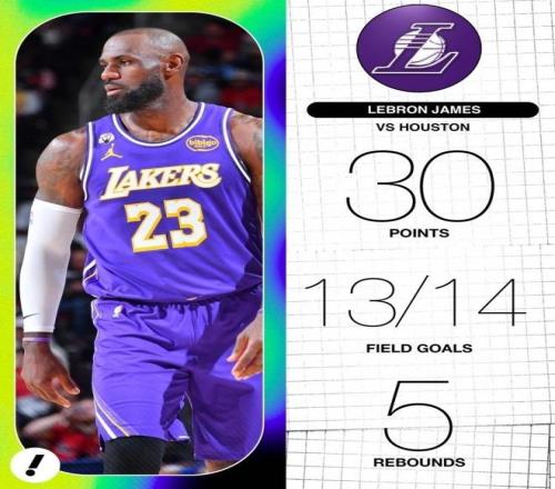 本場比賽,湖人球星詹姆斯上場34分鍾,投籃14投13中,得到30分5籃板2助攻1搶斷1蓋帽。詹姆斯本場的投籃命中率高達92.9%,追平生涯最高紀錄。據統計,這是詹姆斯生涯第14場比賽在不超過15次出手得到30+分。