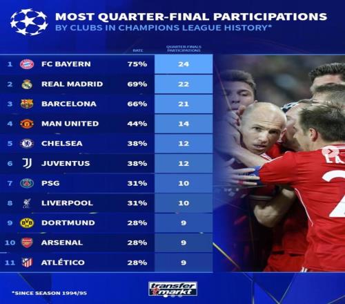 北京時間3月20日,在本賽季歐冠8強全部出爐之後,德轉統計出了1994-95賽季至晉級歐冠8強次數最多的11家俱樂部,拜仁慕尼黑以24次高居第一,皇家馬德裏22次第二,巴塞羅那21次第三。