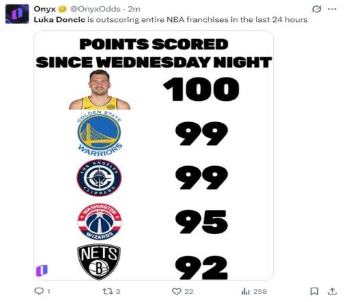數據媒體曬出過去24小時東契奇合計拿到100分,他已經比勇士99分、快船99分、奇才95分、籃網92分更多,一支球隊都不如東契奇24小時內拿下的分數多。