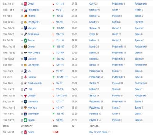 自1月31日以來勇士隊的21場比賽他們隻贏了6場比賽,庫裏缺席的20場比賽輸掉了14場比賽,雖然庫裏的訓練師兼籃球表現教練布蘭登-佩恩聲稱庫裏本賽季肯定會回歸,可目前庫裏依舊沒有確定的複出時間表。