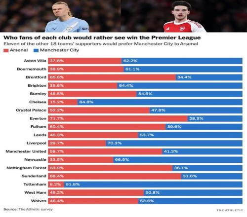 支持阿森納奪冠比例最大的是埃弗頓,達到71.7%,阿森納主帥阿爾特塔球員時期曾是埃弗頓的功勳球員。支持曼城比例最大的自然是阿森納的北倫敦死敵熱刺,多達91.8%的熱刺球迷希望曼城奪冠。西漢姆聯球迷最為均衡,投票接近五五開。