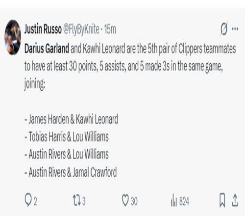 5.加蘭成為快船隊史最年輕的40+10助攻先生超越保羅;