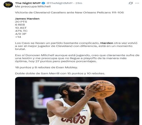 美媒TNM寫道:騎士打了一場很艱難的比賽,哈登再次成為克利夫蘭最出色的球員,米切爾雖然登場了但我覺得他的傷還沒有痊愈,我擔心他不能以100%的狀態進入季後賽。