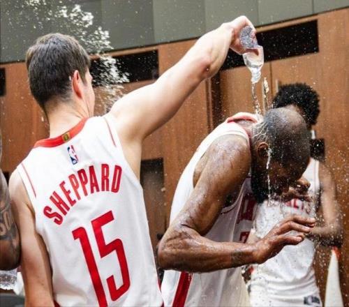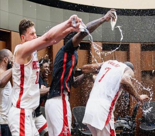 相比於打破紀錄,更重要的是賽後全隊在更衣室中朝杜蘭特潑水慶祝,氣氛非常棒打破了外界對於火箭隊內部不和的一些猜測與流言。