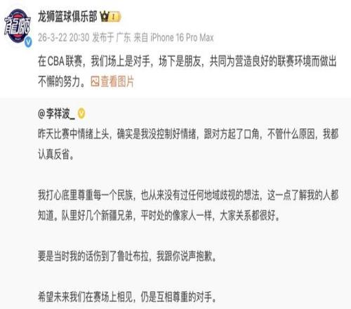 昨晚的CBA常規賽,寧波在主場以83-95不敵廣州。寧波町渥男籃主場不敵廣州龍獅,賽後握手環節,廣州球員李祥波與新疆籍球員魯吐布拉發生衝突。事後,魯吐布拉和廣州龍獅俱樂部均發文進行回應。