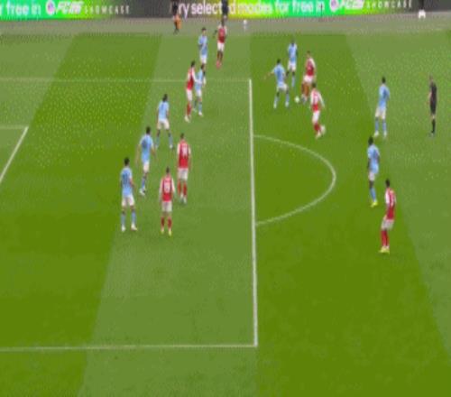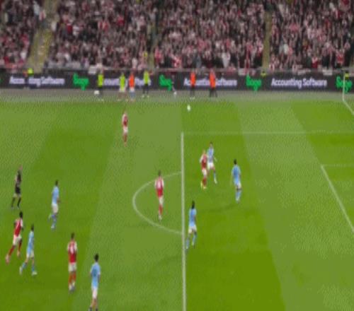開場僅7分鍾,薩卡右路突破橫傳,蘇維門迪跟上直塞,哈弗茨單刀推射,被特拉福德神勇封堵,隨後薩卡連著兩腳補射,依然沒能打穿曼城門將的十指關。