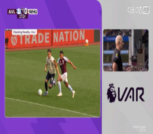 第27分鍾,沃特金斯禁區倒地,裁判觀看VAR後取消點球判罰