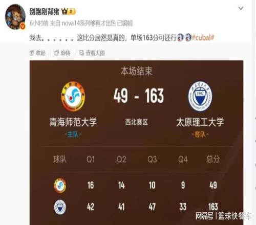 中國籃壇又出現大比分分差了。近日,在CUBAL聯賽上又再次出現誇張分差。太原理工大學(以下簡稱太原隊)客場挑戰青海師範大學(以下簡稱青海隊)。這是一場毫無懸念的比賽,雙方首節便拉開了26分的分差,半場太原隊已經手握53分領先優勢。雙方經過四節比賽後,太原隊最終以163-49狂勝青海隊114分,締造了CUBAL聯賽又一大慘案。