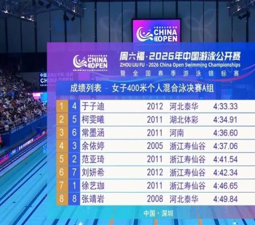 13歲的於子迪憑借這個成績成為全國曆史上在400米混合泳第四快的選手。葉詩文4分28秒43第一,李玄旭4分30秒43第二,齊暉4分30秒85第三。