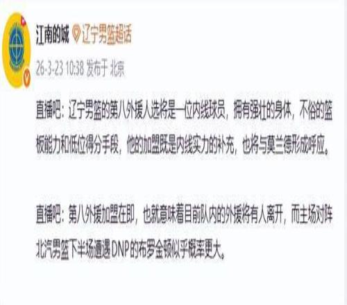 在輸給北京首鋼後,遼寧男籃暴露出內線進攻乏力的致命短板——盡管莫蘭德成功限製對手中鋒麥基,但自身在低位得分與籃板保護上仍顯疲軟。管理層迅速響應,據知名媒體人“江南的城”透露,遼寧即將簽下第8名外援,一名具備強壯體格、出色籃板和低位背打能力的內線球員,旨在與莫蘭德形成攻防互補。