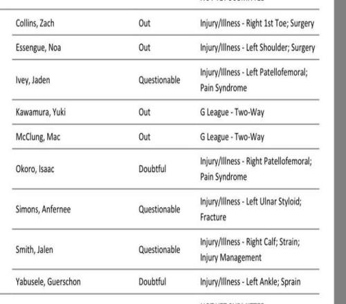 公牛隊這邊缺陣的人更多,他們有4位球員缺陣,5位球員出戰成疑。紮克科林斯因為右大腳趾手術,本場比賽缺陣,艾森格因為左肩手術缺陣,另外,後衛河村永輝以及扣籃王麥克朗都被下放到發展聯盟,他們這場比賽也不會回歸。公牛隊還有5位球員因為受傷出戰成疑,分別是奧科羅、安芬尼西蒙斯、傑登艾維、傑倫史密斯以及亞布塞萊。