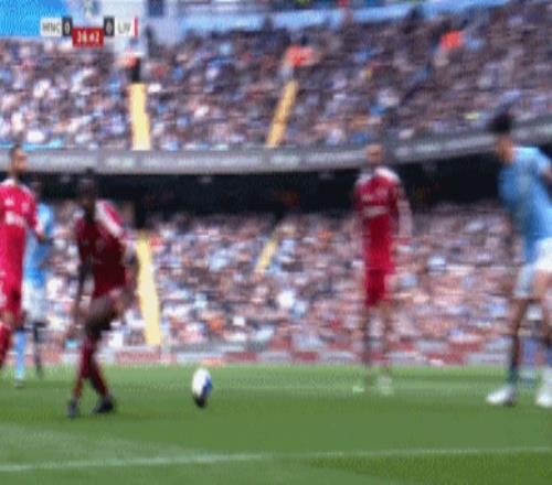 利物浦占據優勢,但曼城的1次反擊,就讓利物浦付出代價。第37分鍾,奧賴利禁區內拿球轉身,範戴克伸出右腳將奧賴利絆倒,主裁吹罰點球!