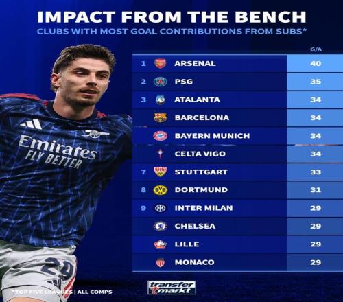 北京時間4月8日,德轉統計出了本賽季至今歐洲五大聯賽球隊替補球員在各項賽事中直接參與進球數的排行榜,阿森納以40球排名第一,巴黎聖日耳曼35球第二,巴塞羅那和拜仁慕尼黑34球並列第三。